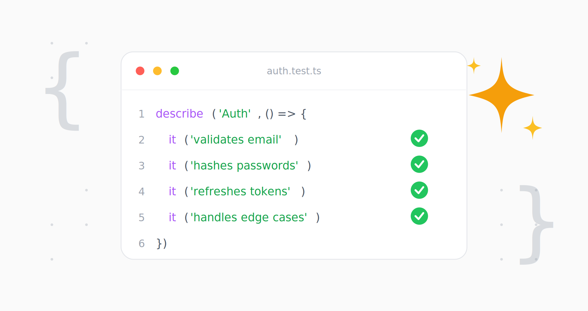 No backend Node.js, suítes em Jest, Vitest ou Mocha cobrindo controllers, services e repositories saem com setup completo de mocks do banco. E quando você está em C#, xUnit ou NUnit com Moq seguem a mesma lógica: descreva a regra de negócio, receba os testes.
